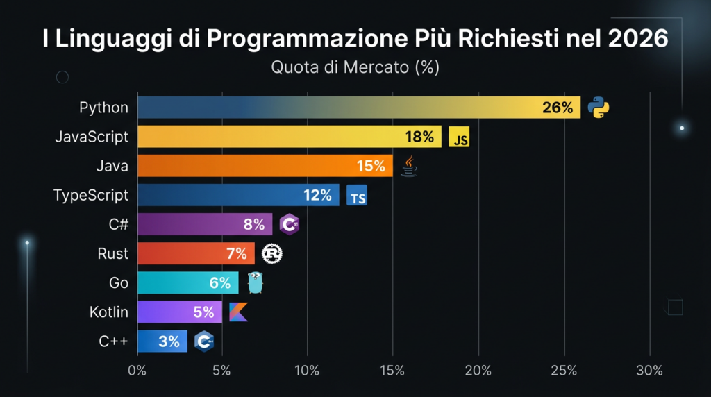 Nel 2026, il panorama dei linguaggi di programmazione è più diversificato che mai. Non esiste un “linguaggio migliore” in assoluto — la scelta dipende dalle esigenze specifiche del progetto, dal settore e dagli obiettivi aziendali.