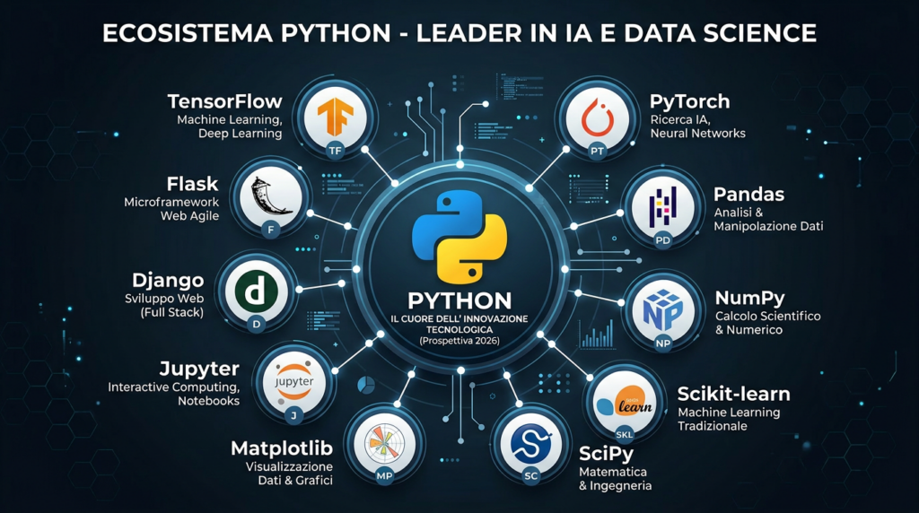Python domina il mercato grazie alla sua versatilità straordinaria. È il linguaggio di riferimento per lo sviluppo di intelligenza artificiale, machine learning, data analysis e automation. Librerie come TensorFlow, Pandas, PyTorch e scikit-learn lo rendono la scelta preferita per i data scientist e gli AI engineer di tutto il mondo.