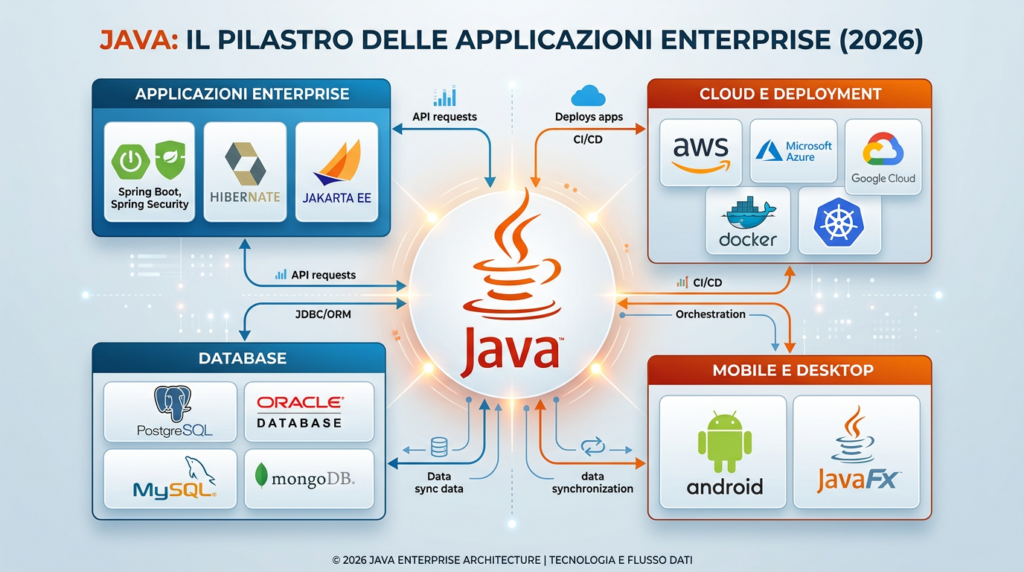 Java rimane il fondamento delle applicazioni enterprise, nei sistemi backend robusti e nelle architetture cloud. La sua stabilità, portabilità e vasto ecosistema lo rendono la scelta preferita per i sistemi mission-critical.