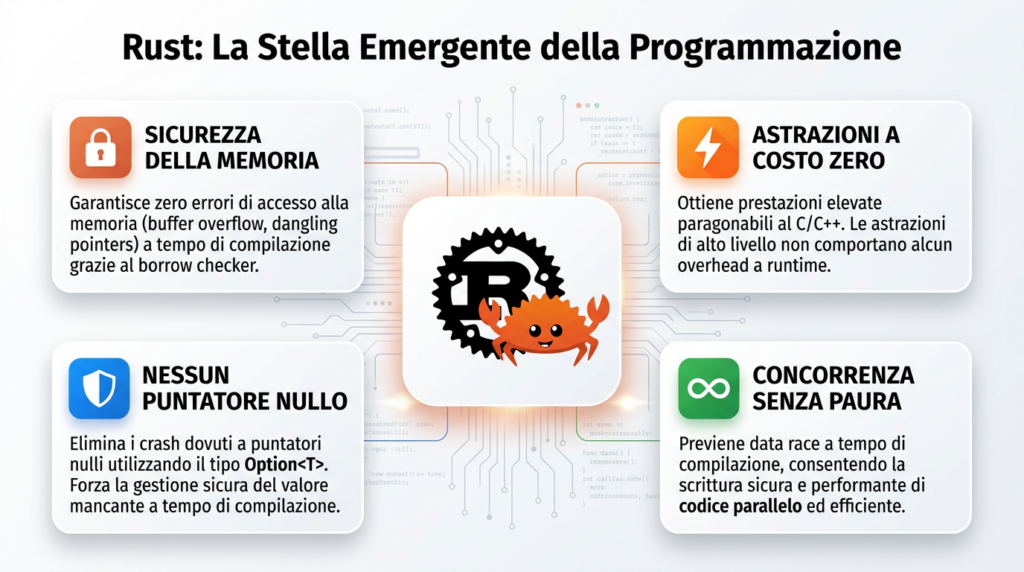 Rust rappresenta una nuova generazione di linguaggi di programmazione. Con focus su sicurezza della memoria e performance, Rust sta guadagnando trazione nei sistemi critici, cloud-native applications e nei domini embedded dove la sicurezza è prioritaria.ei domini embedded dove la sicurezza è prioritaria.